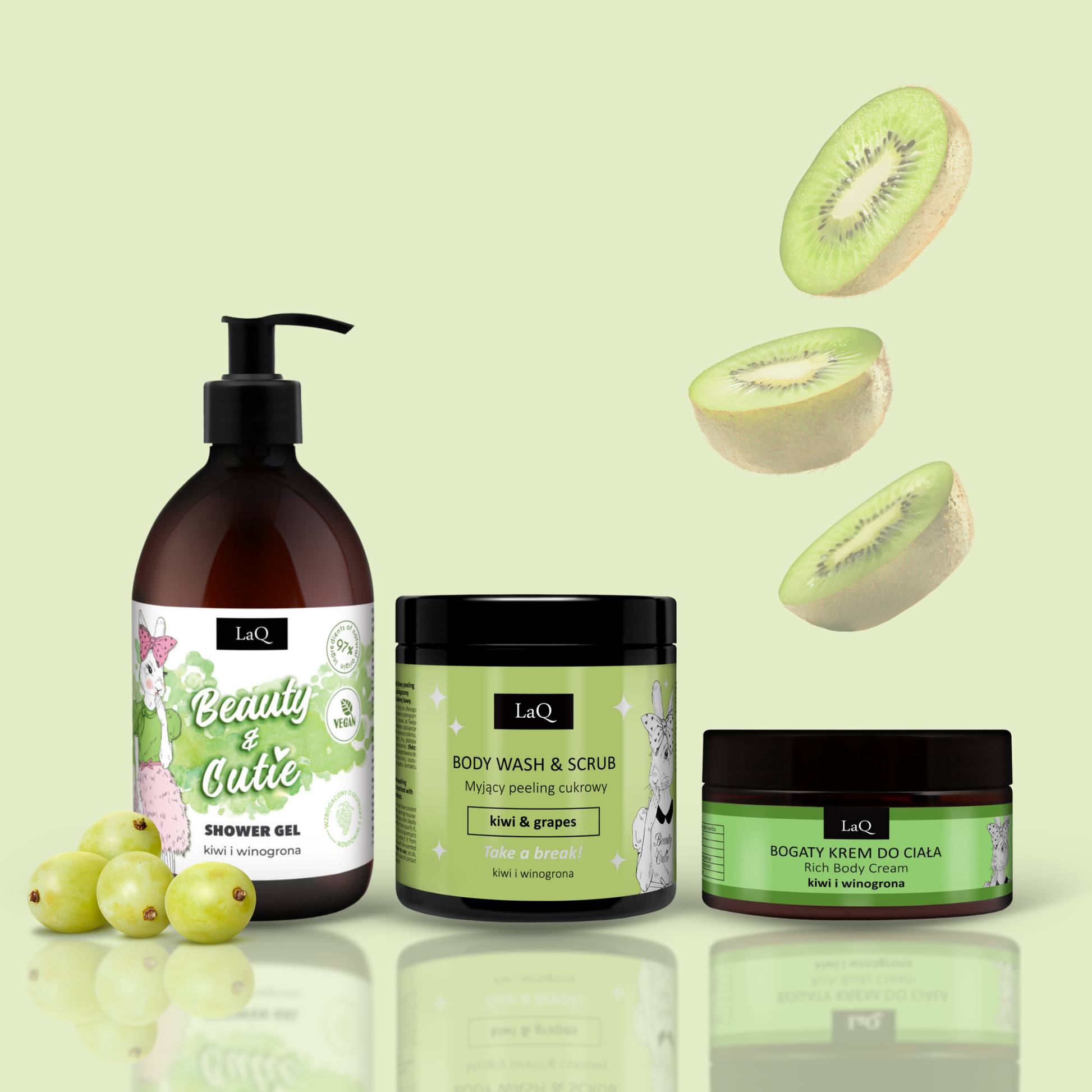 Ég er vegan sett af náttúrulegum líkamsvörum með safaríkum, ávaxtaríkum ilm af kíví og vínberjum. Í settinu finnurðu sturtugel, hreinsandi líkamskrúbb og nærandi líkamskrem. Ég var hönnuð fyrir virkar, lífsglaðar og félagslyndar konur sem dreifa jákvæðri orku hvert sem þær fara.