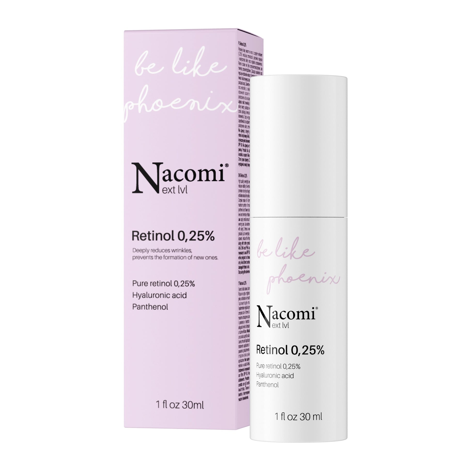 Retinol 0,25% high quality overnight serum with pure retinol (0,25%) reduces visibility of wrinkles and discolorations. Retinol provides not only anti-aging but also anti-acne action. It exfoliates dead skin cells and regulates sebum secretion. Complex made of 4 forms of hialuronic acid assures maximum portion of moisture while using. Glycerine, panthenol and flower oils extract keep proper moisture level and minimize irritations for the best effects.